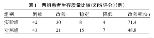 患者行4个周期化疗后测定ZPS评分,与第一次化疗前测定ZPS评分进行比较,实验组患者生存质量明显优于对照组,两组改善率比较差异有统计学意义(71.4%vs48.8%,X2值=4.5183,P=0.046),见表1