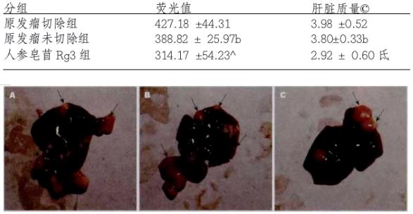图3 治疗10d后BALB/c nu nu裸鼠结肠癌肝转移模型剖离肝脏情况 A:原发瘤切除组;B:原发瘤未切除组;C:人参皂苷Rg3组