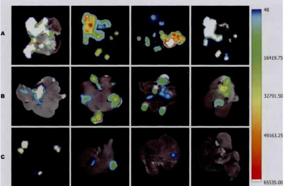 图4荧光活体成像法观察治疗后结肠癌肝转移模型裸小鼠剖离肝脏GFP基因的表达.A:原发瘤切除组;B:原发瘤未切除 组;C:人参皂昔Rg3组.