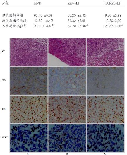 治疗后人参皂昔Rg3组细胞凋亡指数较原发瘤切除组和原发瘤未切除组有明显的升高(P<0.01,表2,图5)。