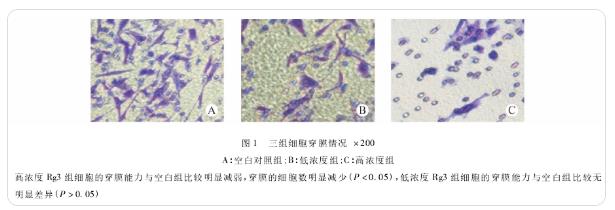 Rg3作用后,Lovo/5-Fu细胞侵袭能力明显降低,中、高浓度Rg3组比较对照组穿膜的细胞数明显减少(P<0.05),见表3。