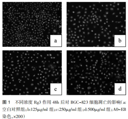 见表3,图1。AO-EB染色显示:空白对照组结构形态饱满,结构清晰,表现出均匀绿色的荧光。随着Rg3剂量的加大,荧光显微镜下凋亡细胞数增加,表现为:细胞核体积缩小,核固缩,凋亡小体形成,大量细胞碎片,细胞膜被染成红色(图1)。由表3可见,用药各组间两两比较差异有统计学意义(P<0.05)。
