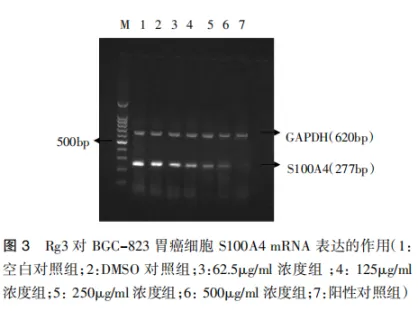 p53是促细胞凋亡的抗癌基因,p53的高表达可诱导细胞凋亡,通过RT-PCR方法检测,笔者发现随着Rg3干预浓度的上升(62.5、125、250、500μg/ml)可明显上调BGC-823细胞的p53 mRNA表达(图2),而S100A4 mRNA的表达随药物浓度增高出现逐渐下调的趋势。除了DMSO组和空白对照组比较没有差异外,其他各组两两比较差异均有统计学意义(均P<0.05,图3)。