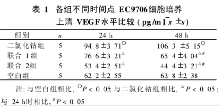将75μmol/L的二氧化钴单独或联合30、60Lg/ml的Rg3作用于食管癌EC9706细胞24h和48h,分别收取细胞培养上清液,用ELISA法检测其中血管内皮生长因子(VEGF)水平,以含10%胎牛血清RPMI1640培养基做空白对照。
